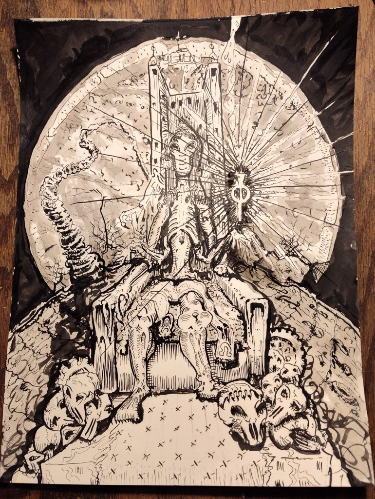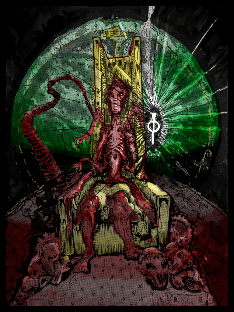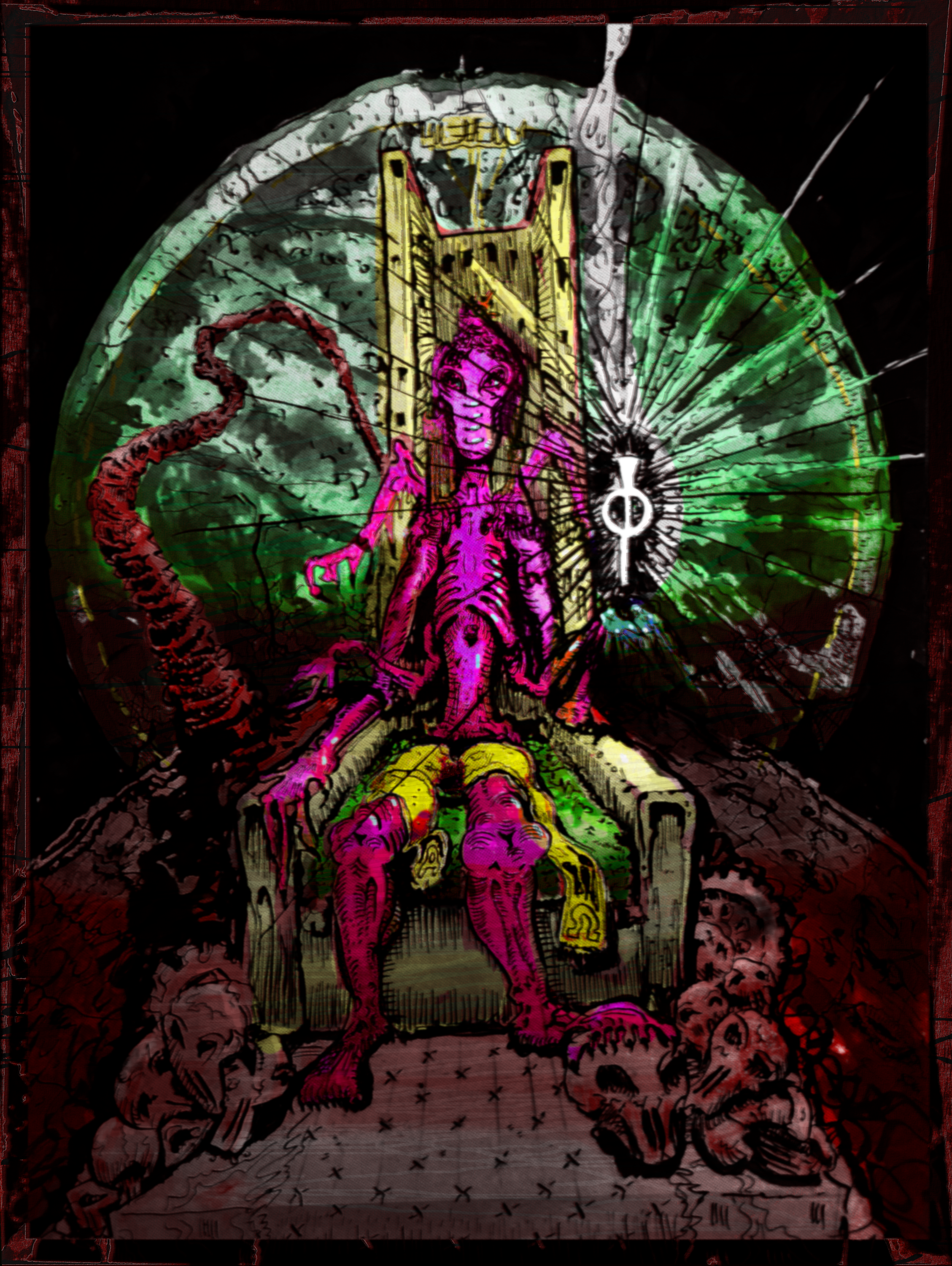 It is from a universe I’ve been creating, which I call “Wea.” This is the main villain, “Mu.” I like his kneecaps, but I’m uncertain about the rest of the anatomy. However, I can overlook this because Mu is a parasitic, shapeshifting spirit who has grown weary of the many host forms he has collected. He also sees no need to strictly conform to the forms of his followers, as they are so completely under his influence.